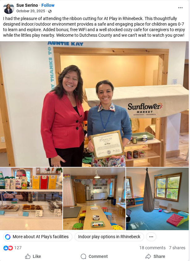 New Rhinebeck Space to Merge Educational Play, Birthday Party Options, and Kids’ Therapy with Parent Gab and Coffee Time Press Press Press Press Press Press The Short Catch: At Play Signs Lease click the images to read click the images to read click the images to read Dutchess County Executive Sue Serino visits At Play!